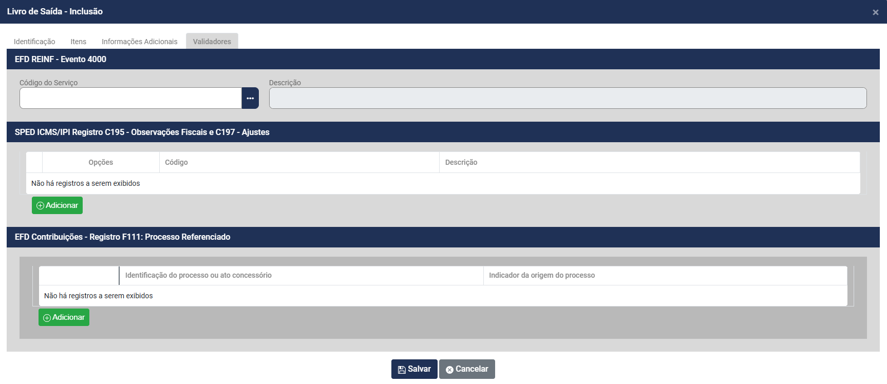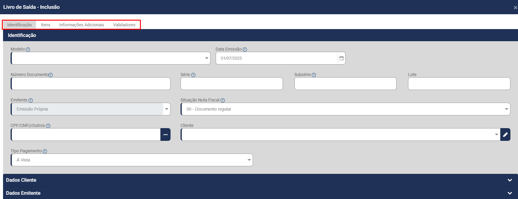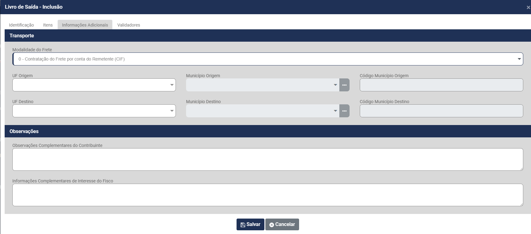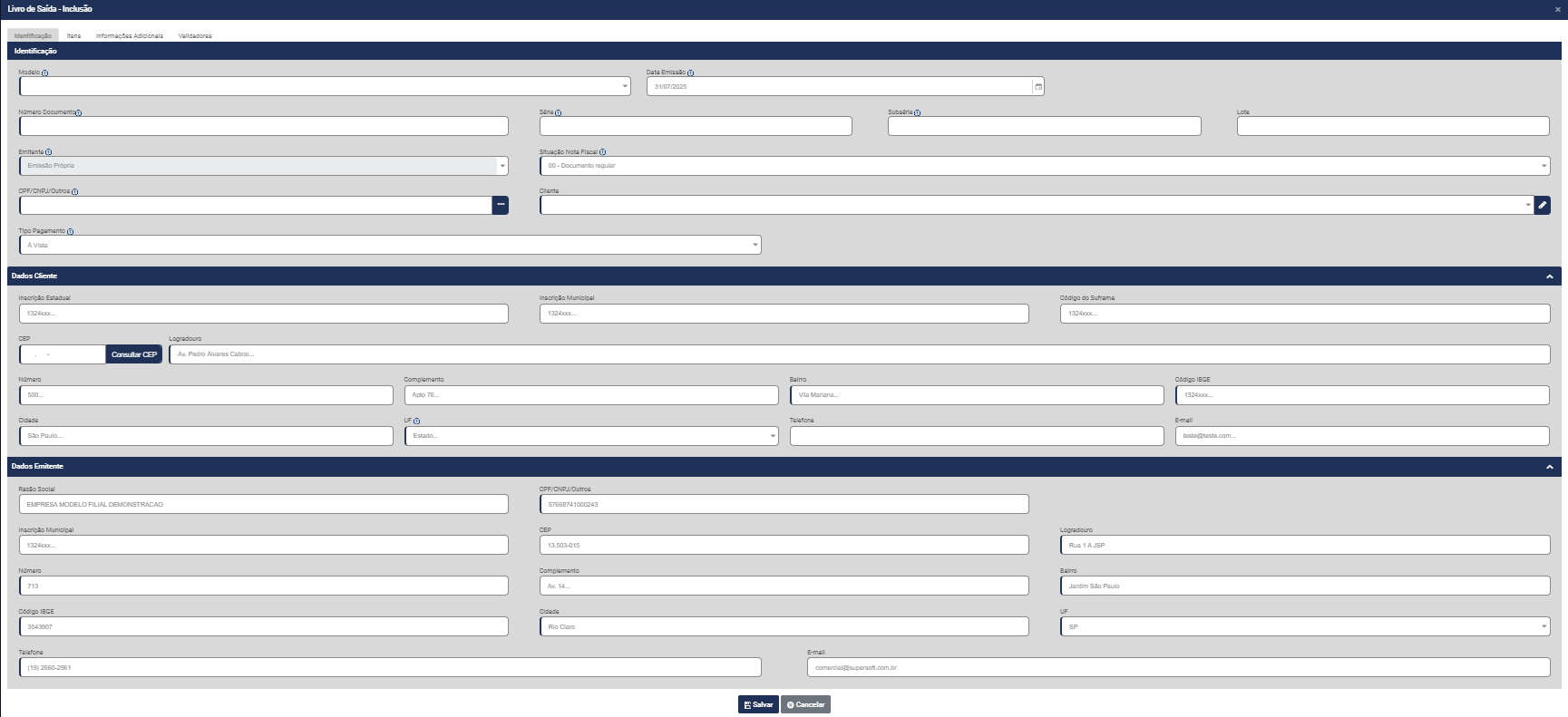 Ao acessar o Botão, o Sistema apresentará a tela para cadastro do Livro Fiscal de Saída de Mercadorias e Serviços, com as abas