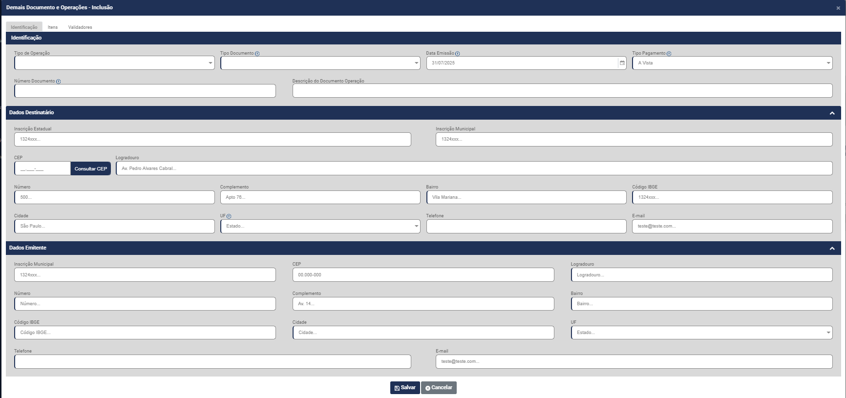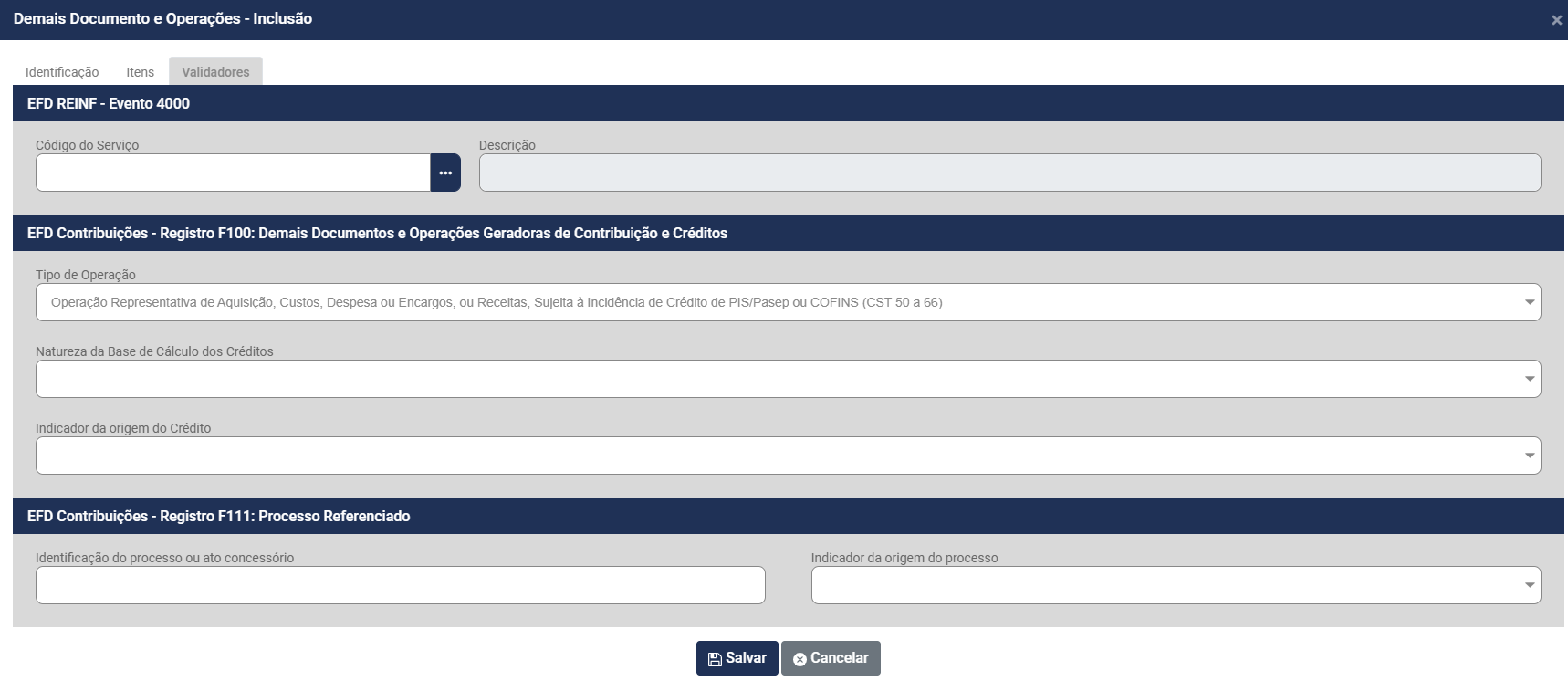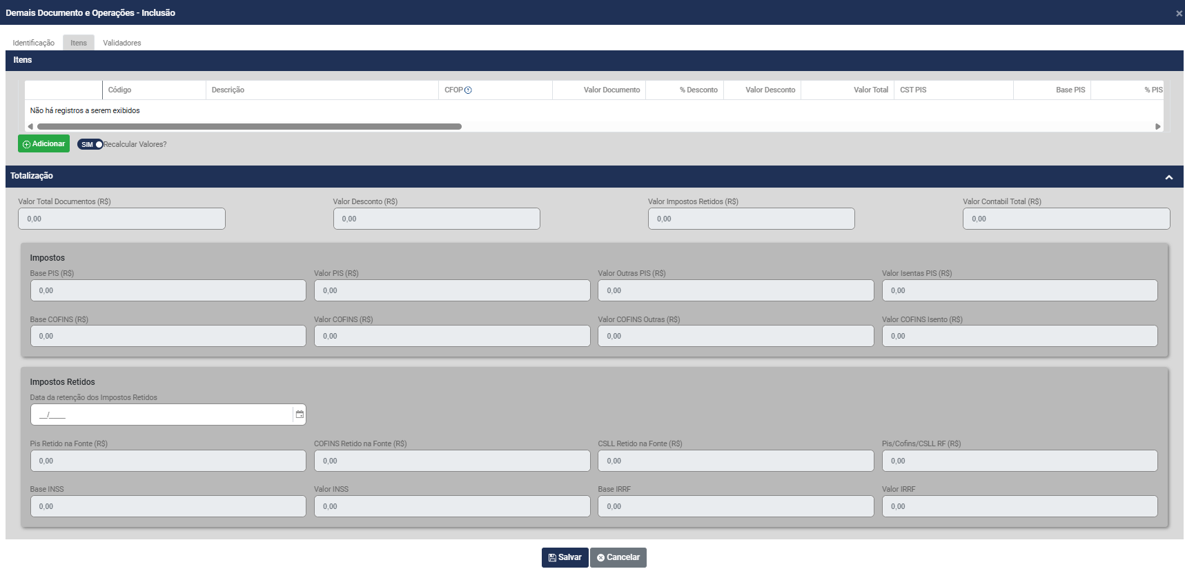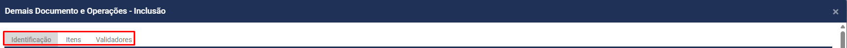 Ao acessar o Botão, o Sistema apresentará a tela para cadastro dos Demais Documentos e Operações, com as abas