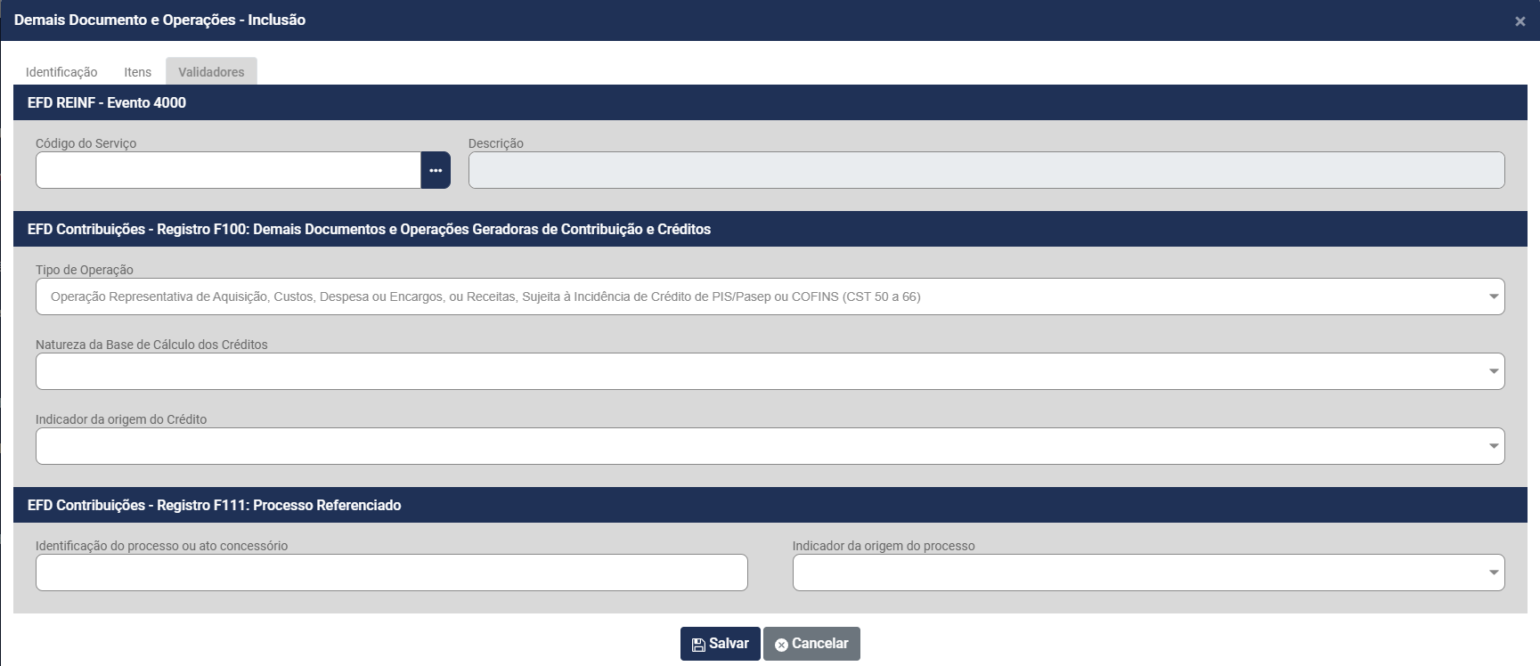 - EFD Contribuições - Registro F100 - Demais Documentos e Operações Geradoras de Contribuição e Crédito