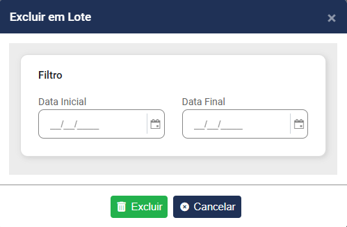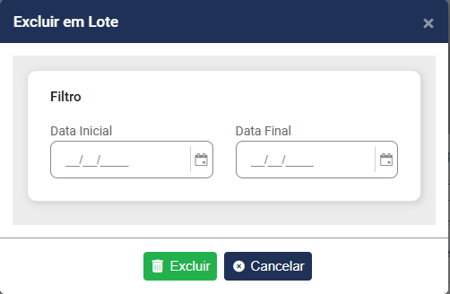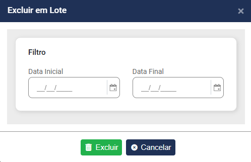Ao acessar o botão, o Sistema apresentará a tela para que você informe a Data Inicial e Data Final das Notas de Entradas que deverão ser excluídas dos Livros de Entrada