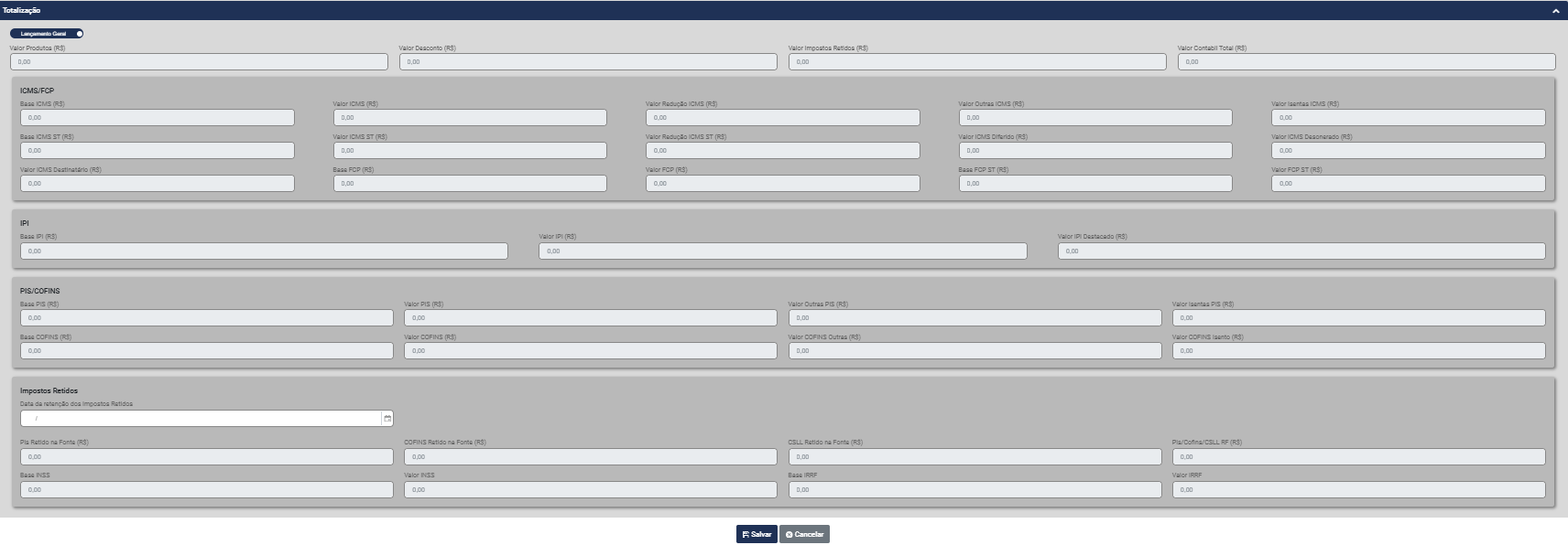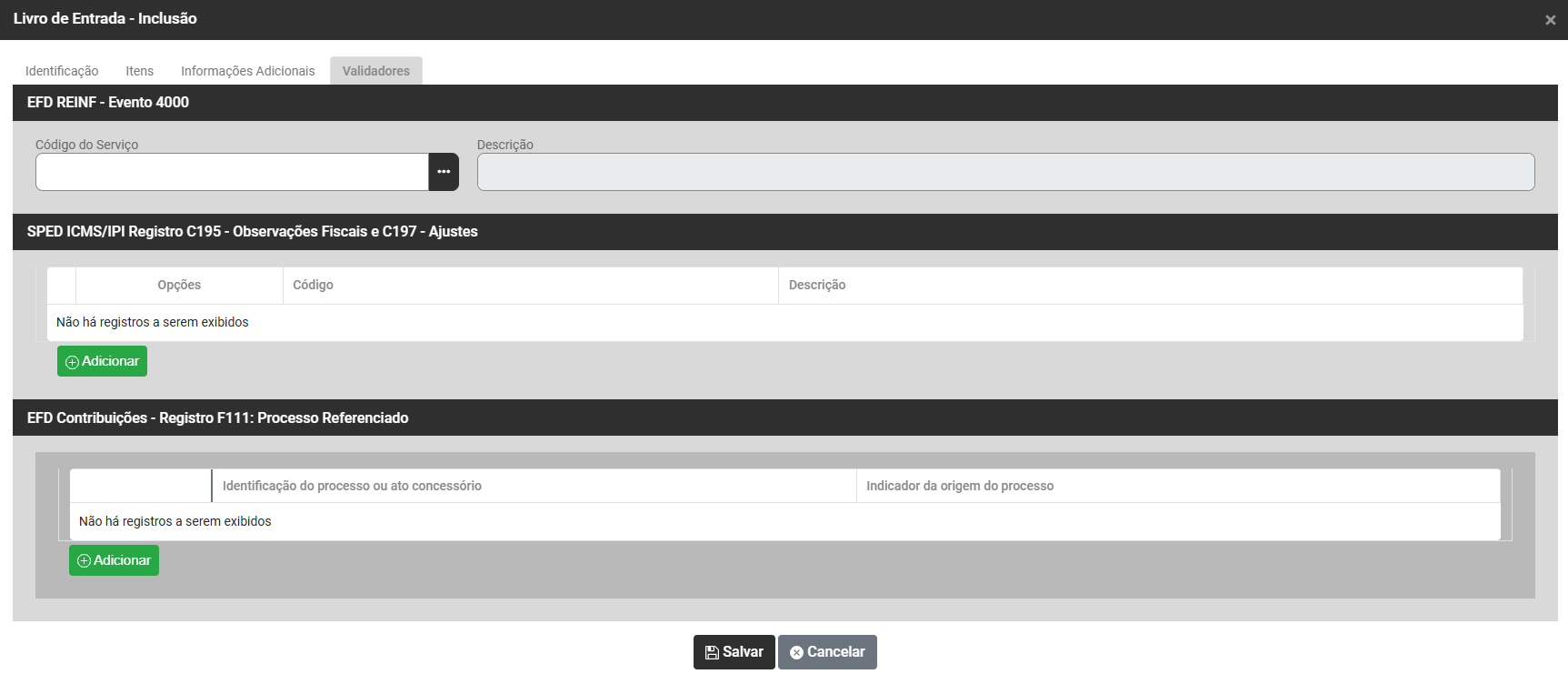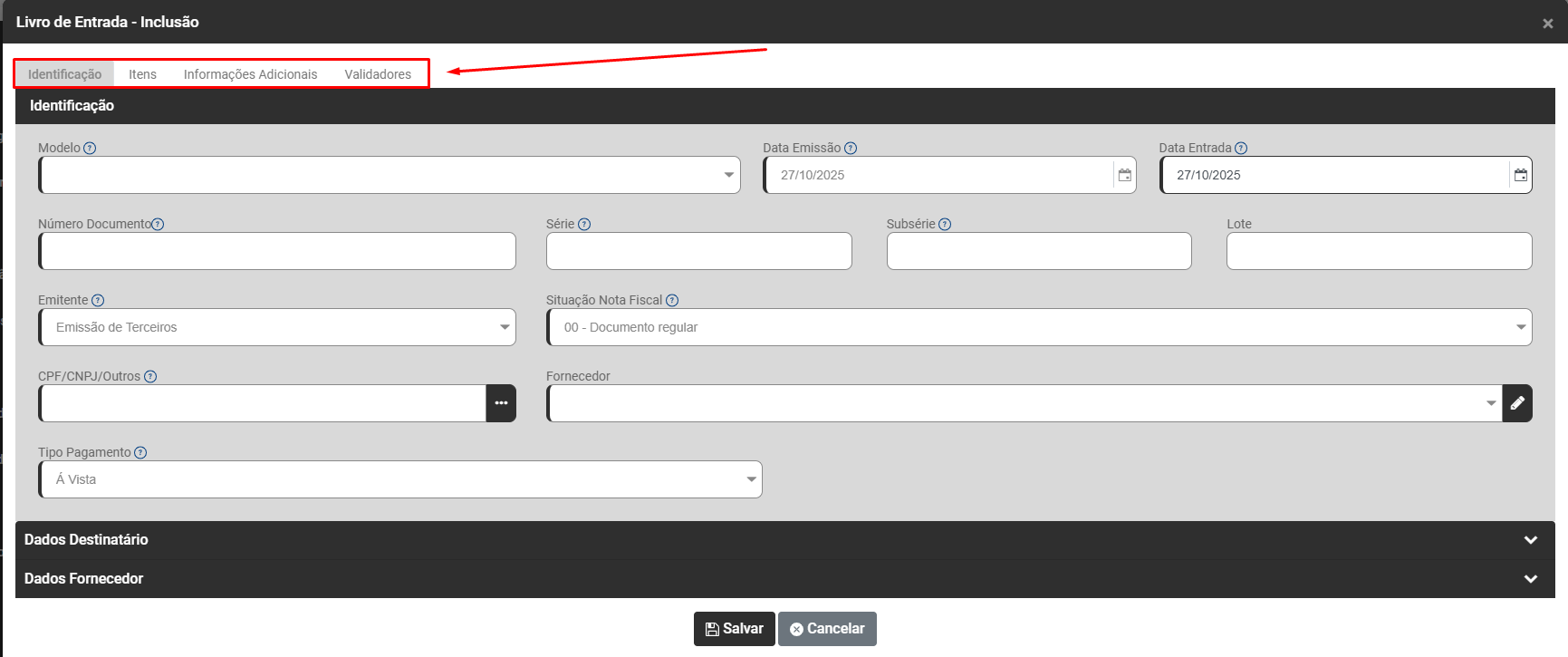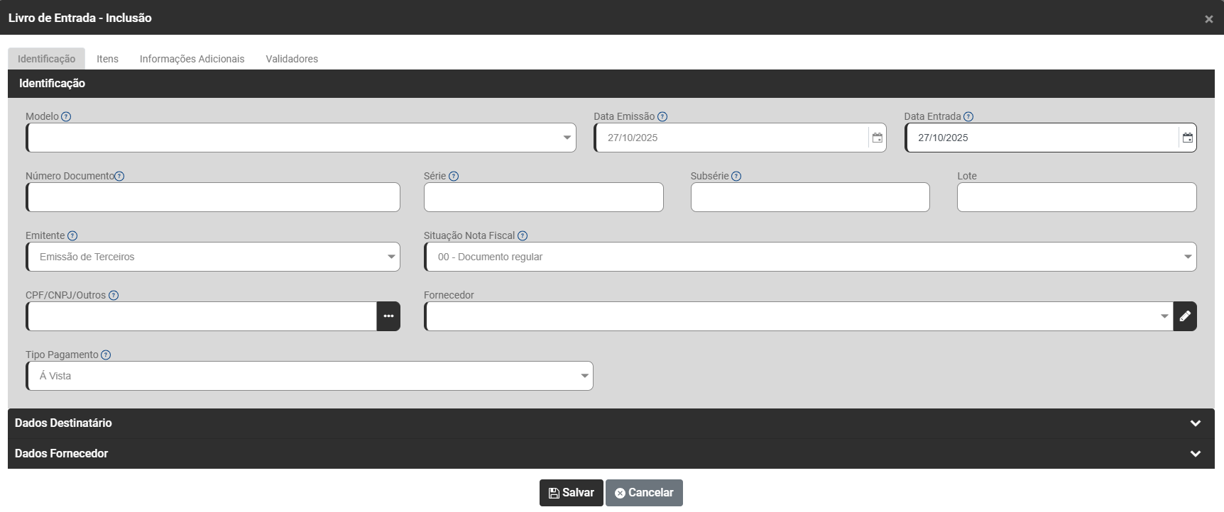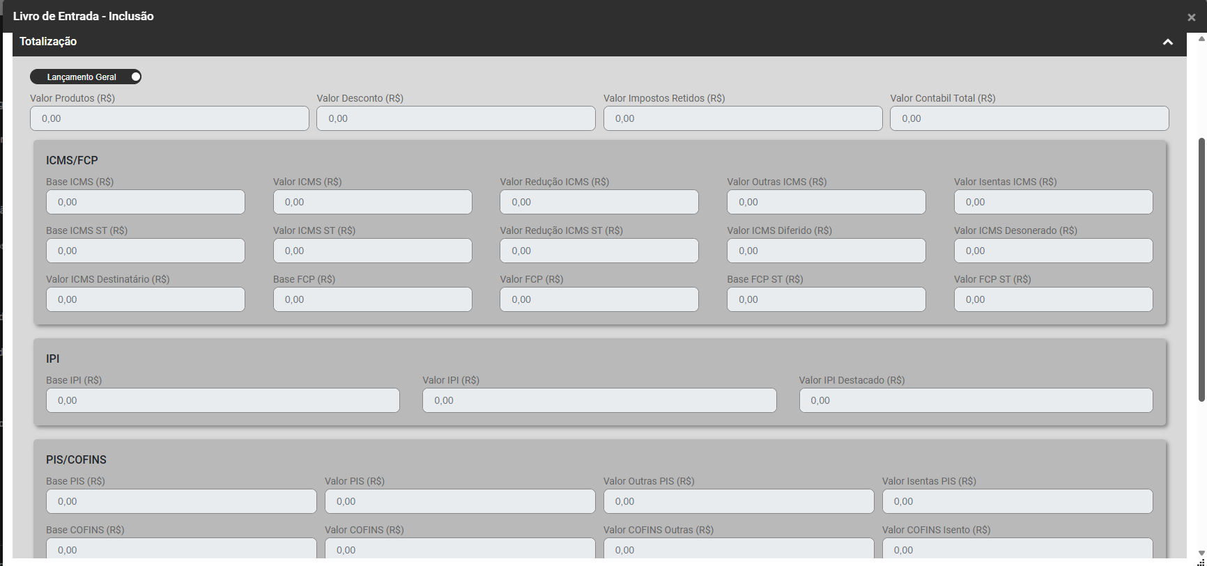 Ao acessar o Botão, o Sistema apresentará a tela para cadastro do Livro Fiscal de Entrada de Mercadorias e Serviços, com as abas
