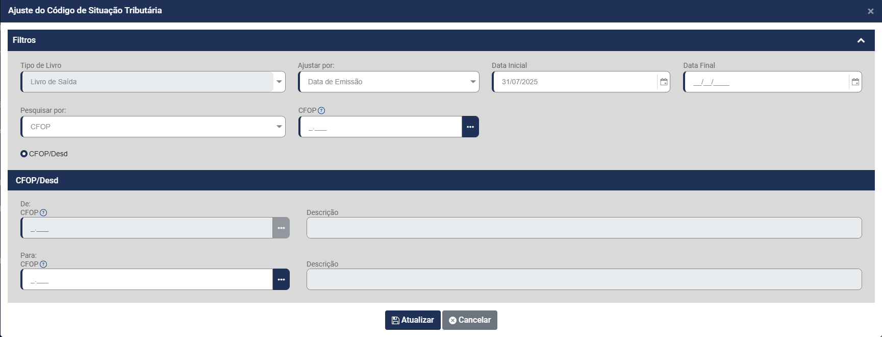 Ao acessar o botão, o Sistema apresentará a tela contendo o campo para Filtrar a Nota de Saída que terá o Ajuste cadastrado e o CFOP/Desdobramento