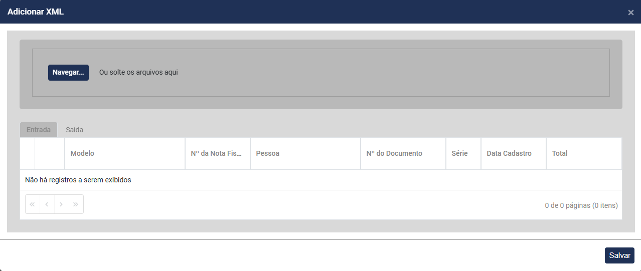 Ao acessar o botão, o Sistema apresentará a tela para que você clique em Navegar e procure pelo arquivo que será importado ou arraste o arquivo para a mesma
