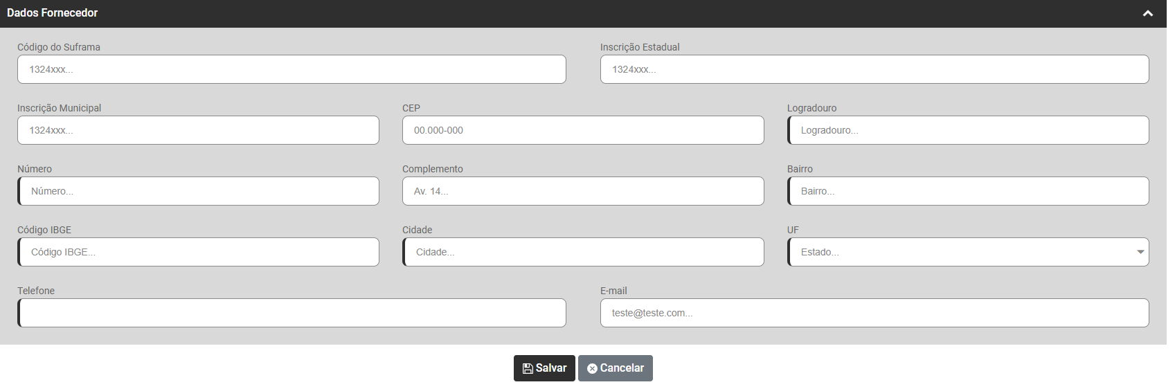 Dados do Fornecedor - Se a emissão for PROPRIA essas informações serão preenchidas com os dados da Empresa definida
