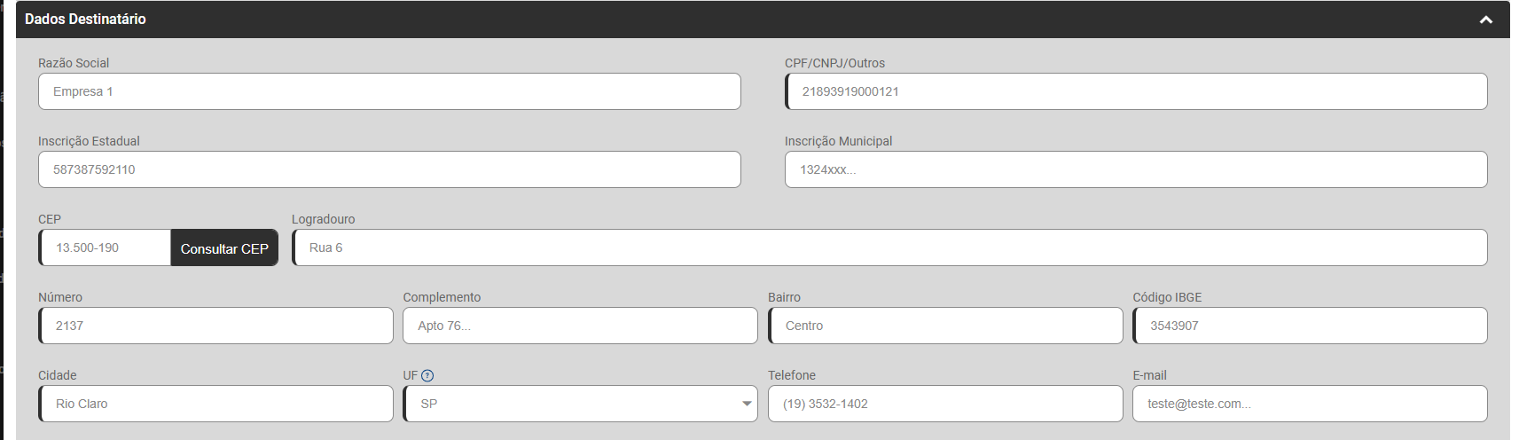 Dados do Destinatário - se a emissão for DE TERCEIROS essas informações serão preenchidas com os dados da Empresa definida