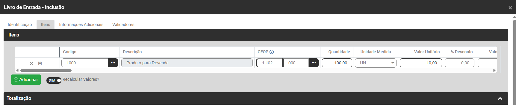 Em Itens, informe os dados dos ItensITENS deDE EntradaENTRADA, através do botão Adicionar e a Totalização
