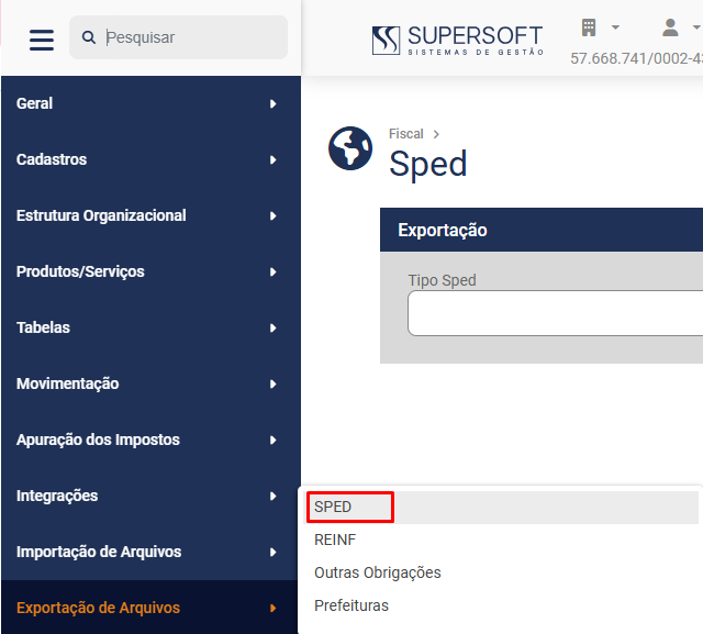 Em seguida, defina o Tipo de Sped que será exportado
