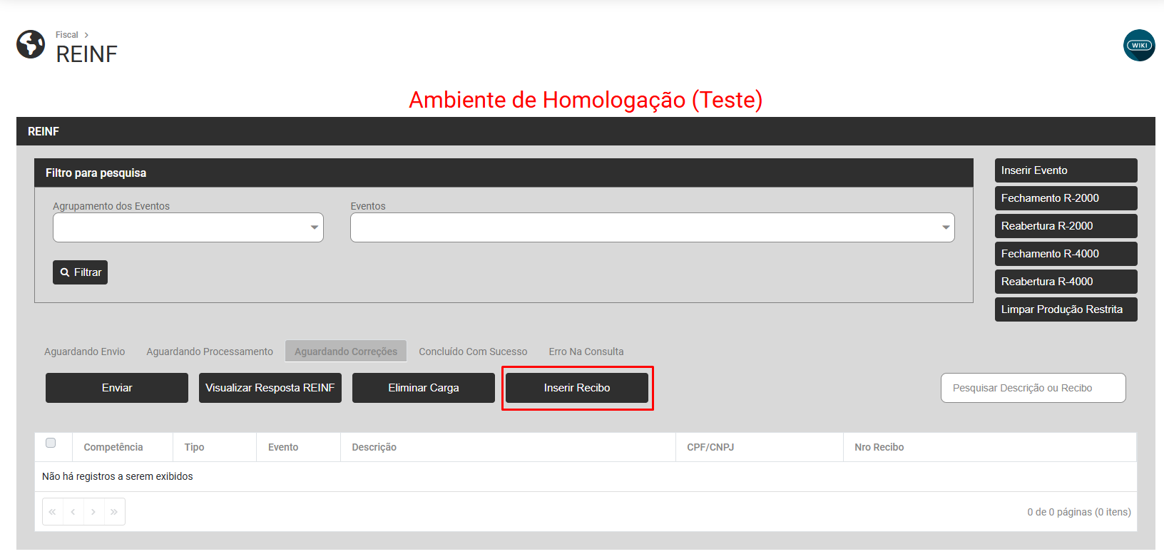 Na aba Aguardando Correções temos também o botão Inserir Recibo, que será utilizado se o evento já foi transmitido e rejeitado, desta forma, selecione o evento, clique em Inserir Recibo e cole o número do Recibo do mesmo
