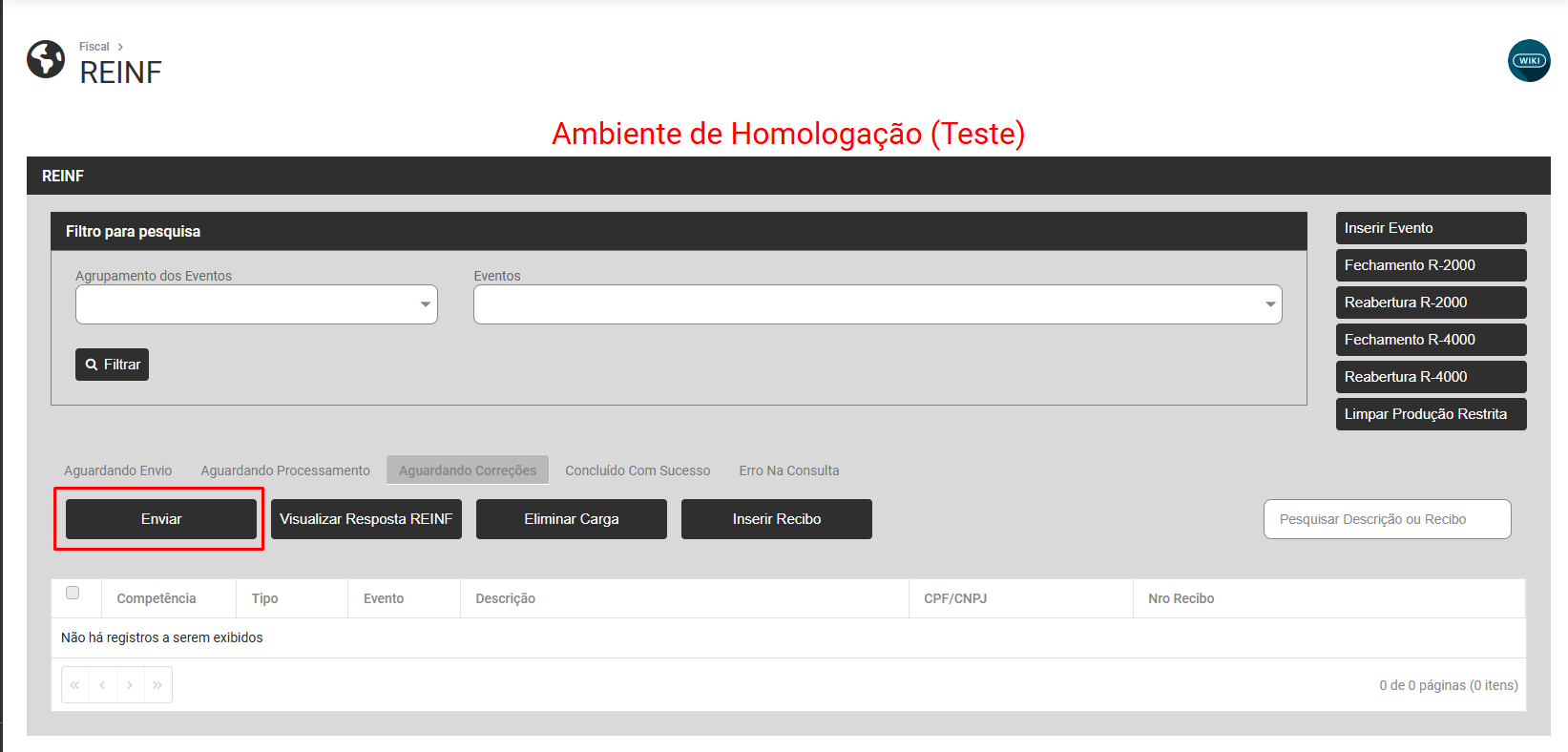 Depois de corrigida a informações que ocasionou o Status Aguardando Correções, selecione o evento e refaça o envio para o REINF