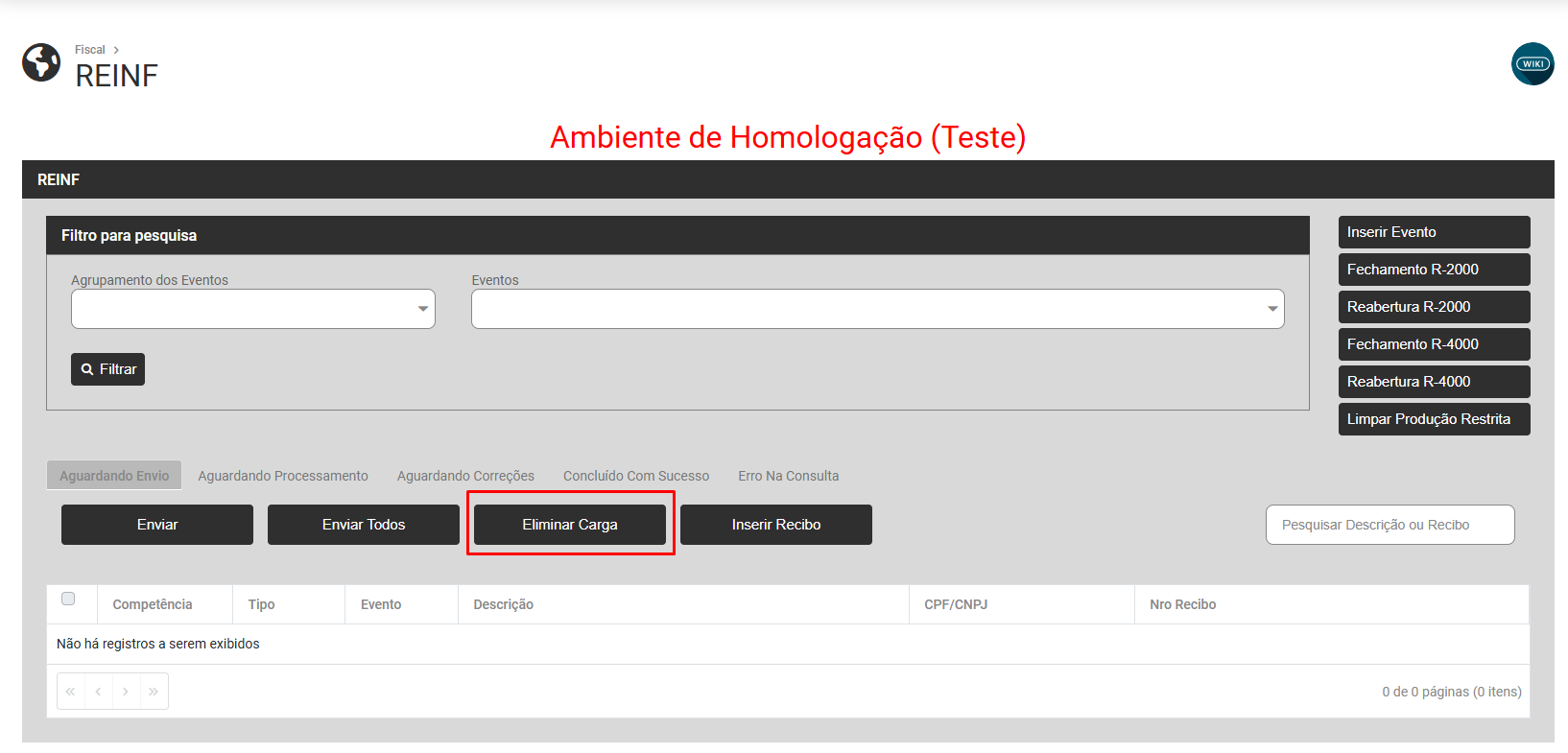 Ainda na Aba Aguardando Envio você terá o botão para Eliminar Carga, e através do botão você conseguir eliminar cargas de eventos que ainda estão com Status Aguardando Envio