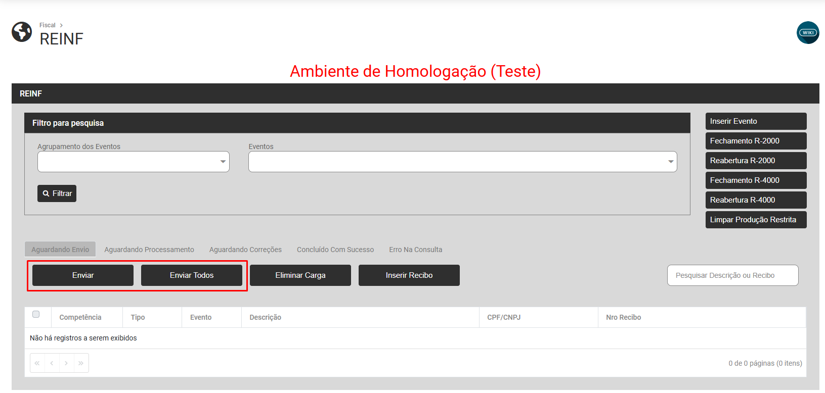Para que você envie o evento, faça a Seleção do mesmo e em seguida clique no botão Enviar ou Enviar Todos