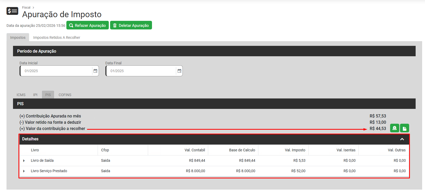 Se houver necessidade de excluir a Apuração de Impostos Realizada, acesse o botão Deletar Apuração existente na parte superior da tela