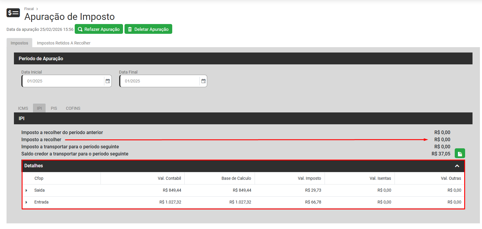 Depois que a apuração for realizada o Sistema irá apresentar o valor apurado no Grid de informações