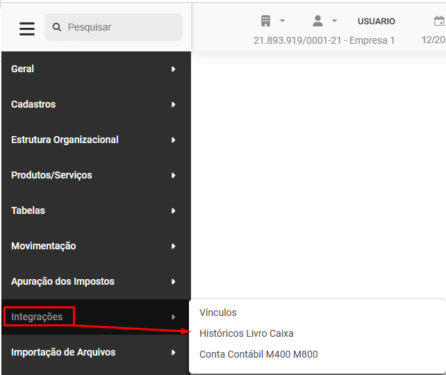Para cadastrar os Históricos para o Livro Caixa você deverá acessar o menu Integrações>Histórico Livro Caixa