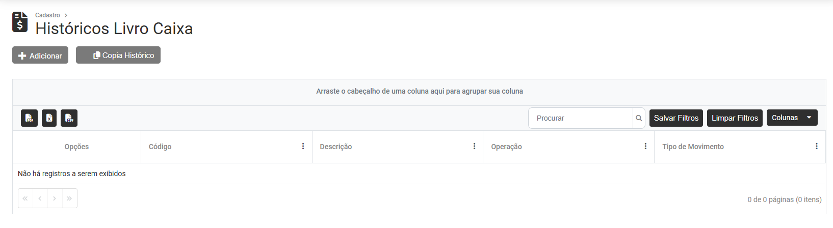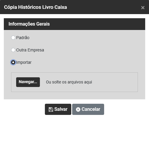 - Padrão - A opção padrão irá copiar os históricos dos livros caixa de uma tabela padrão