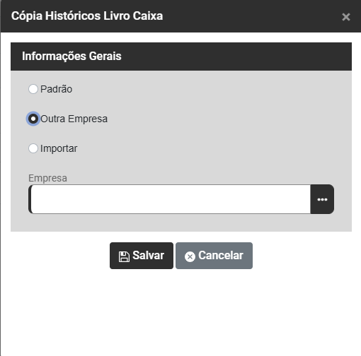 - Outra Empresa - Será aberta a tela para que você defina e empresa da qual os históricos serão copiados
