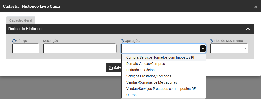 Ao clicar em Adicionar o sistema apresentará a tela para que você faça o cadastro dos Históricos para o Livro Caixa, informe: