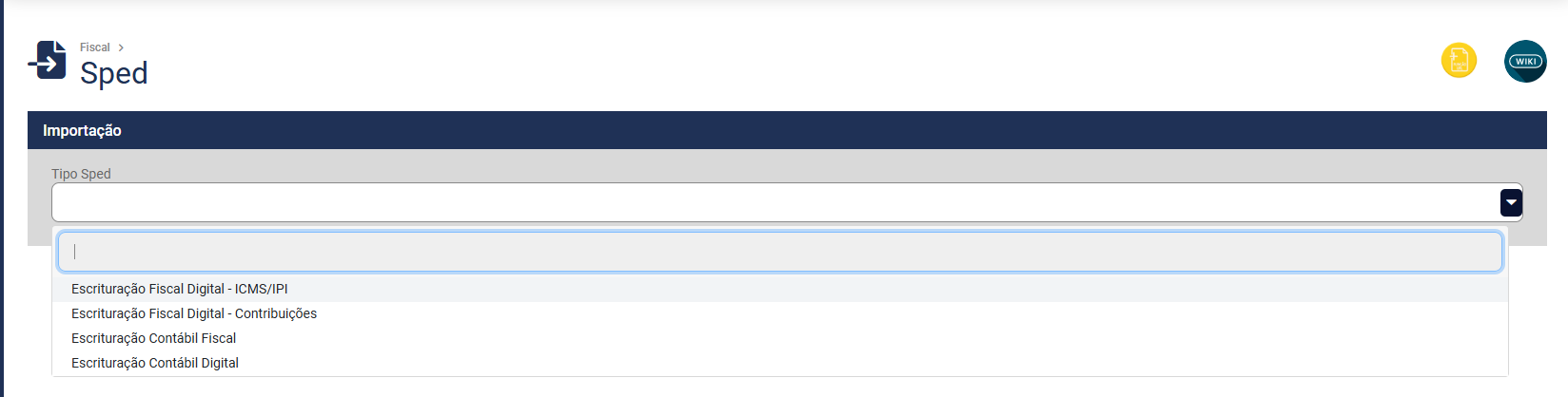 Será apresentada a tela para que você informe o Tipo de Sped que será importado