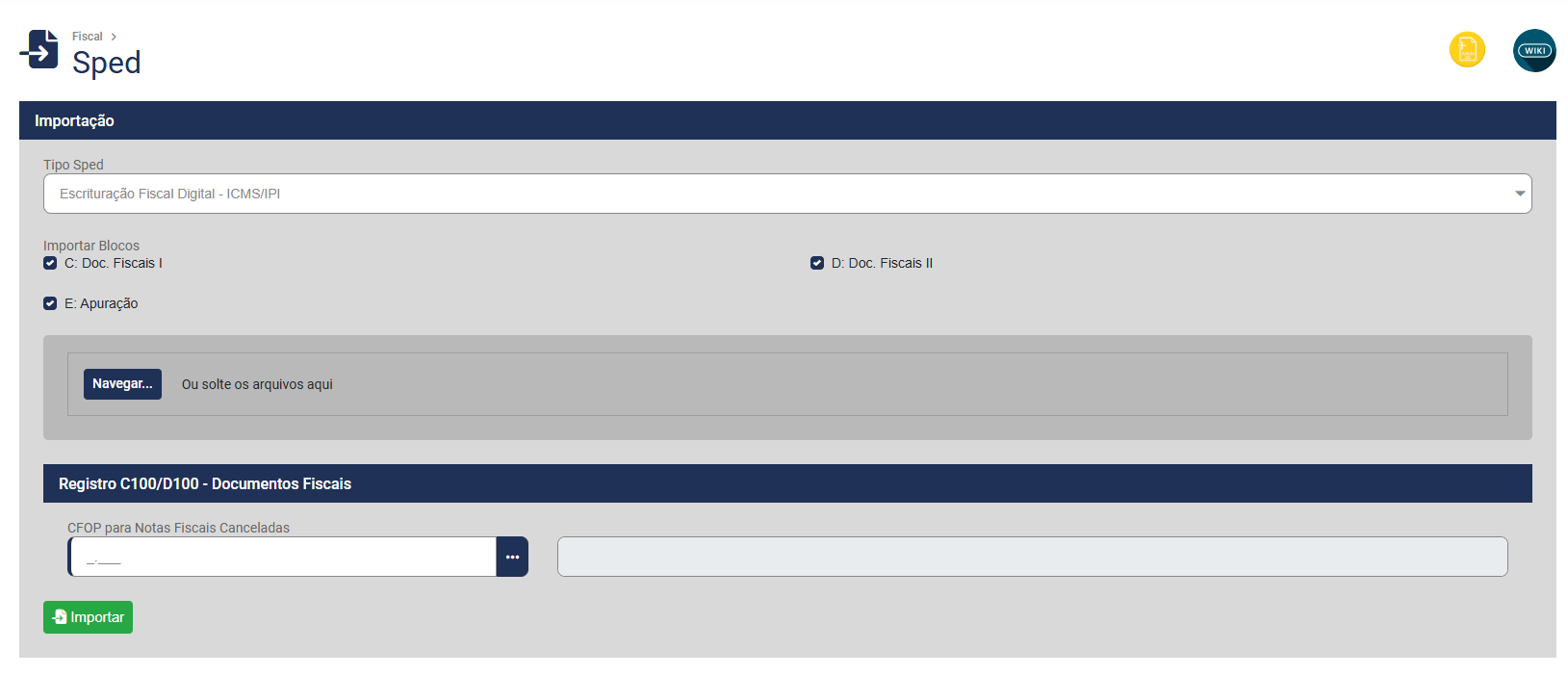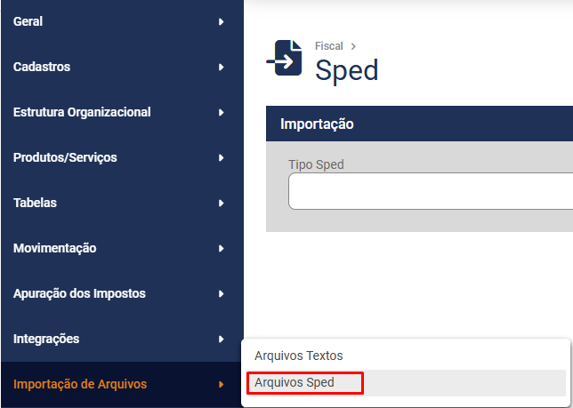 Para que você realize a Importação de Arquivos do SPÈD, acesse o menu Importação de Arquivos>Arquivos SPED