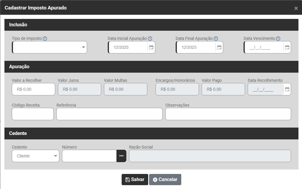 Ao clicar sobre o botão Adicionar será apresentada a tela para que você informe manualmente a apuração do Imposto