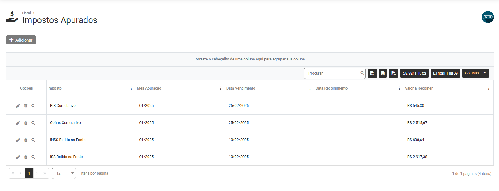 Para visualizar ou Adicionar a Apuração de um Imposto, acesse o menu Apuração dos Impostos>Impostos Apurados