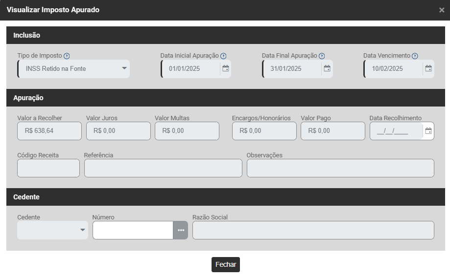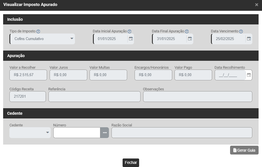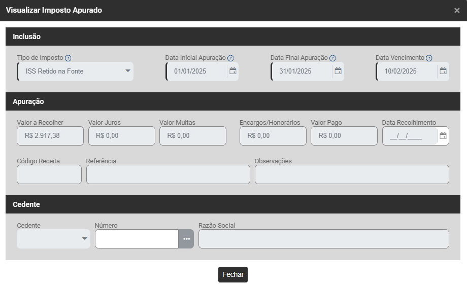 - Data Final da Apuração - Mês da Apuração do Imposto