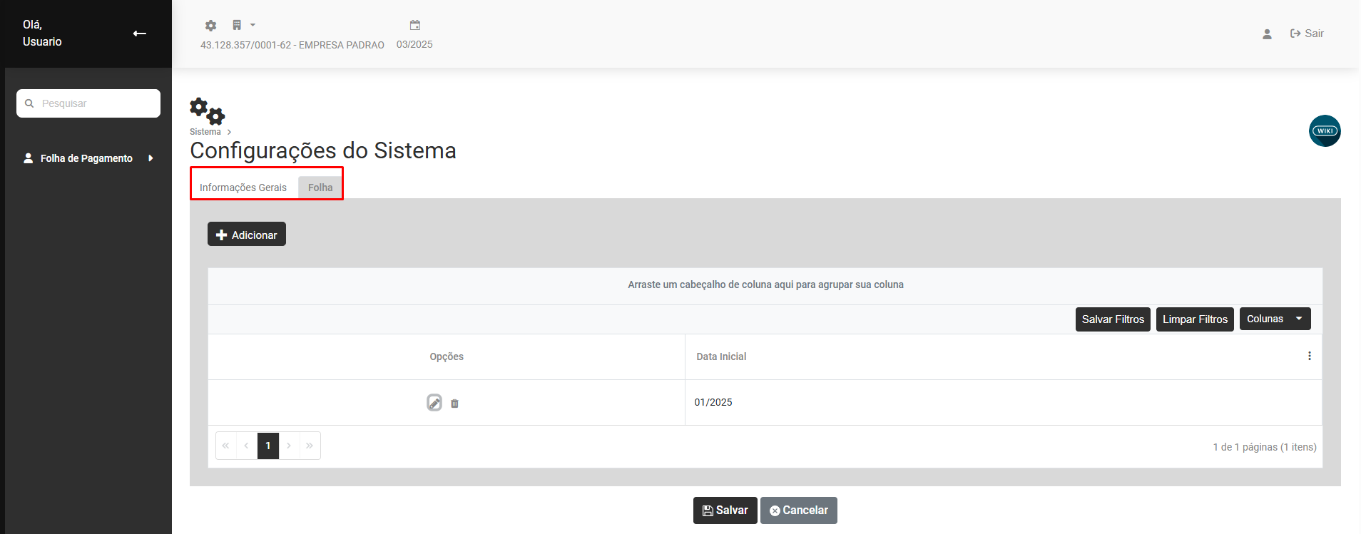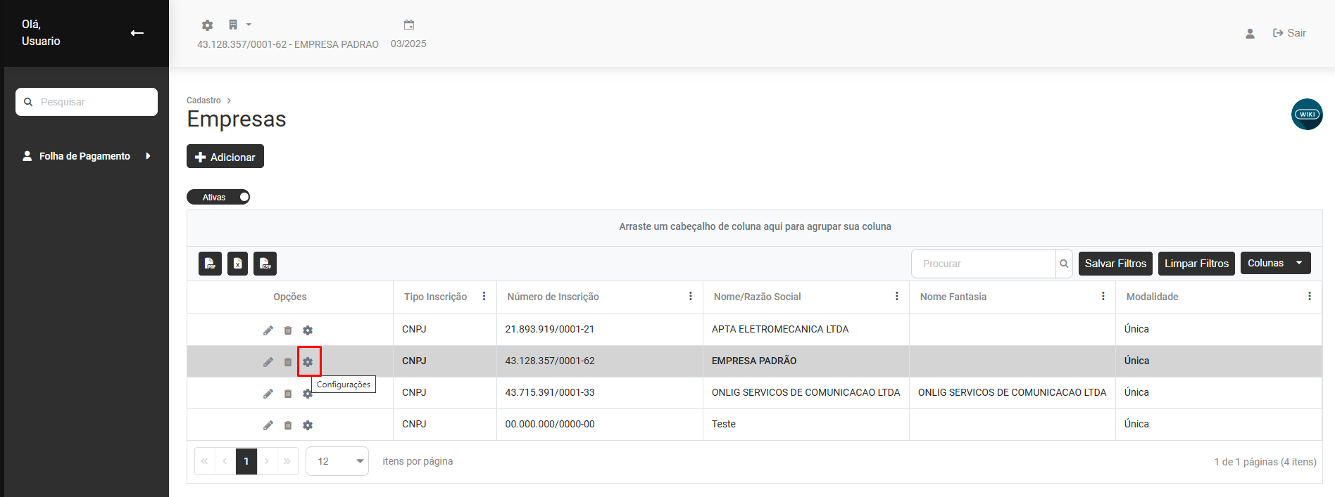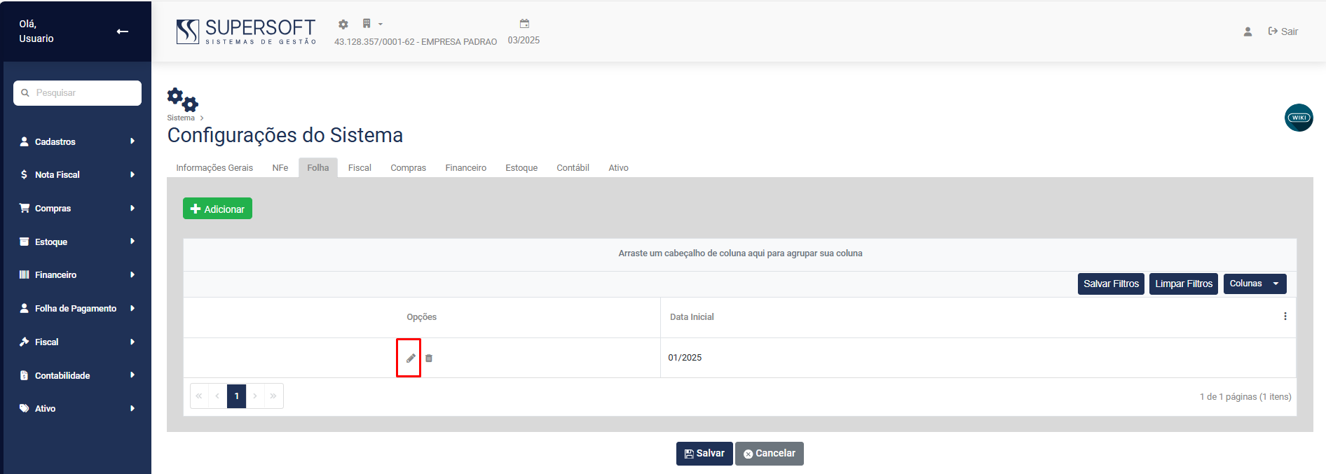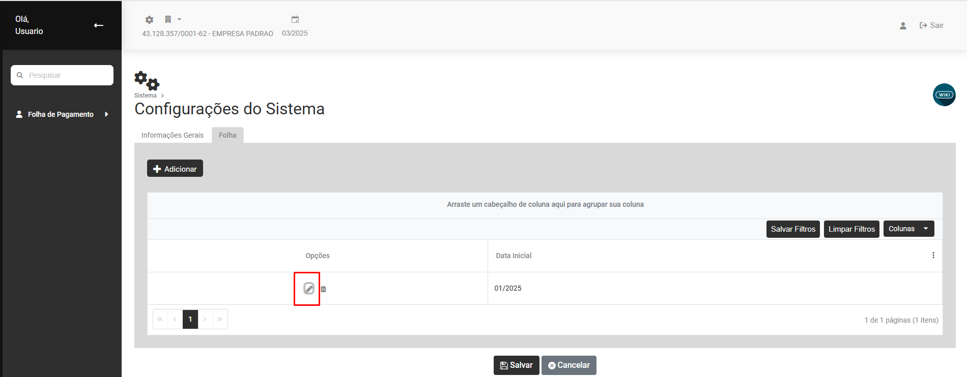 Selecione Folha e será possível Editar ou Excluir as Configurações do Módulo Folha de Pagamento.