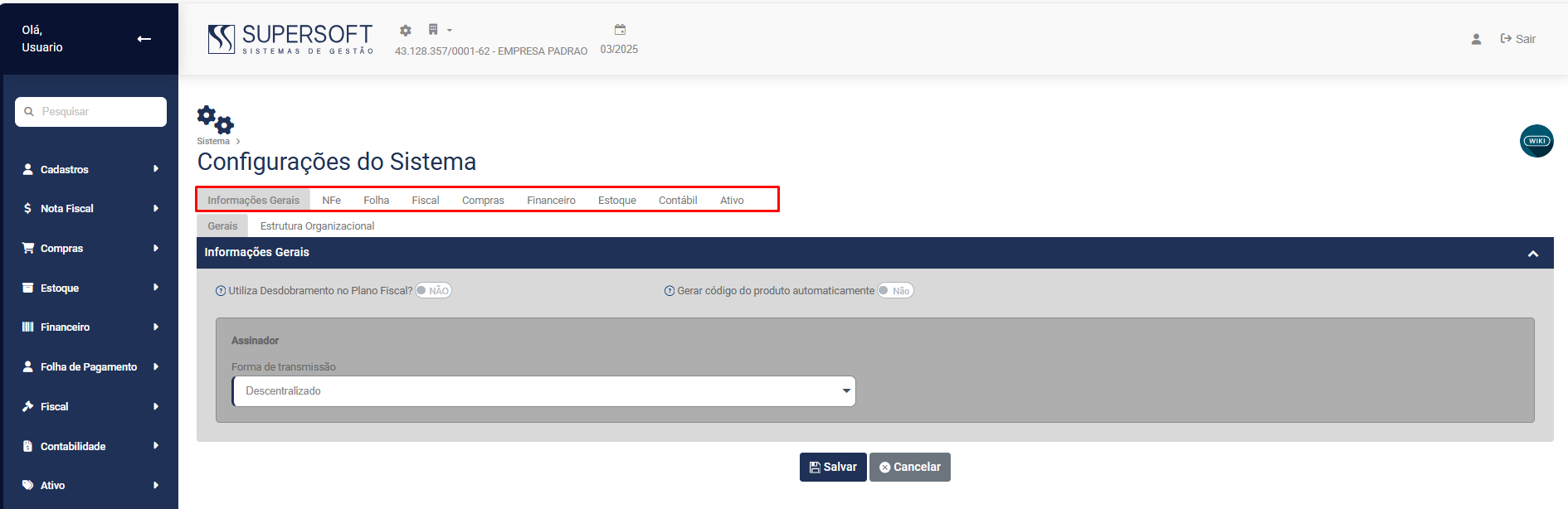 Ao acessar o botão Configurações, o Módulo apresentará a tela com as Informações Gerais (informações padrões que servirão e atenderão todos os Módulos) e as Configurações de cada Módulo que será utilizado por sua Empresa