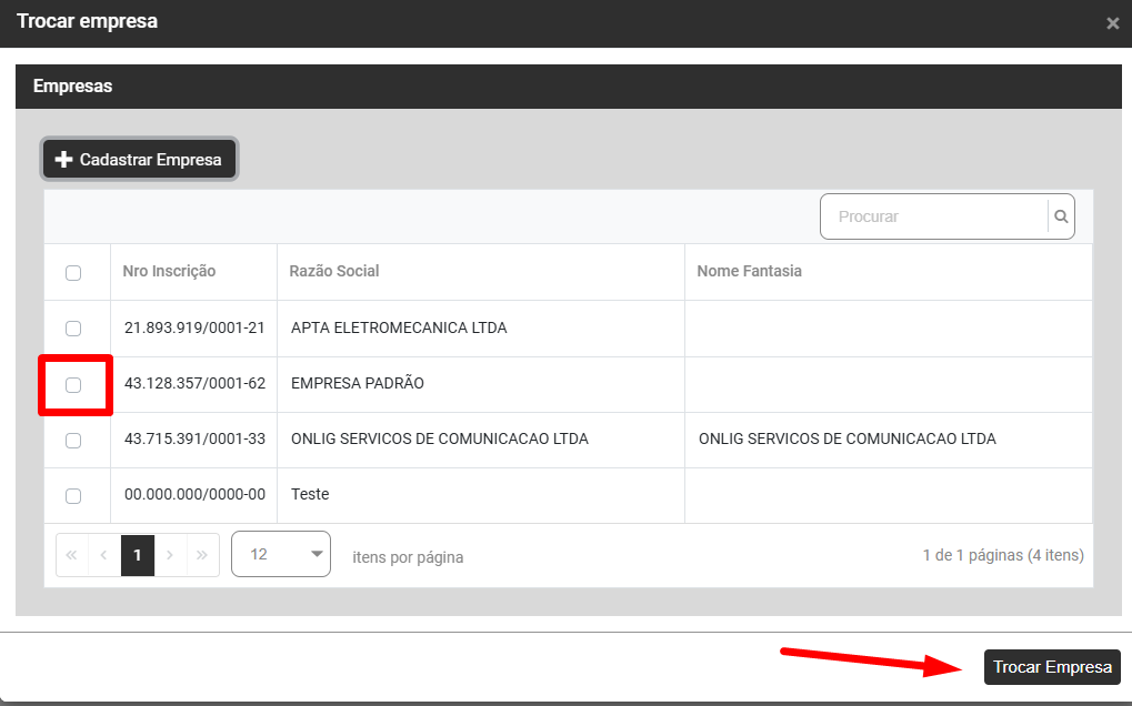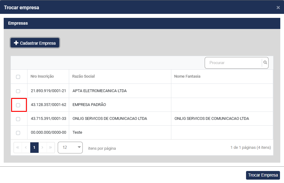 Para que você consiga acessar a Lista de Empresas cadastradas no Módulo, deverá antes selecionar uma Empresa, para isso, no momento em que você acessar o Módulo será apresentada a tela com as Empresas já cadastradas, Selecione a Empresa e em seguida clique em Trocar Empresa