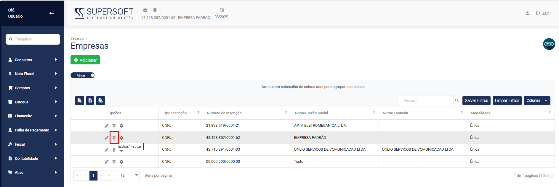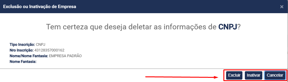 • através deste botão você poderá Excluir a Empresa, Inativar ou Cancelar