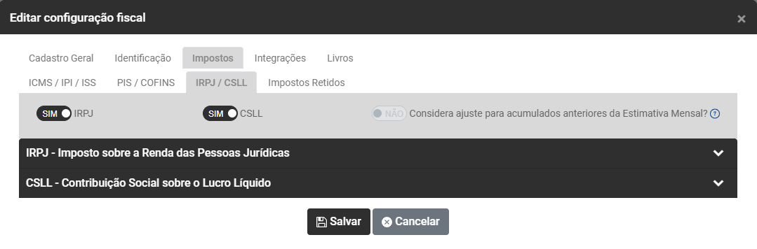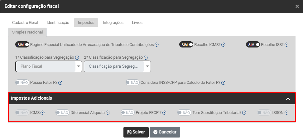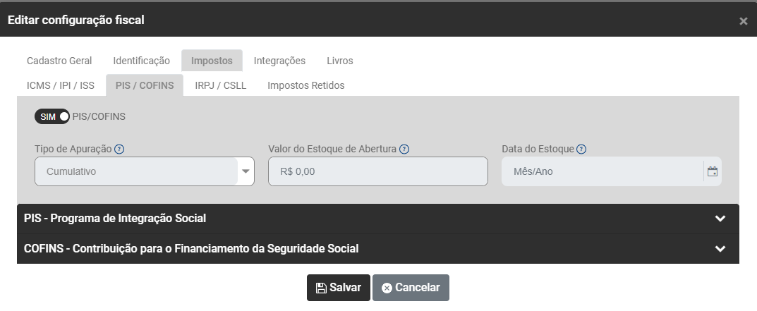 Após essa definição serão apresentados os campos para que você defina a Configuração para apuração de cada imposto selecionado