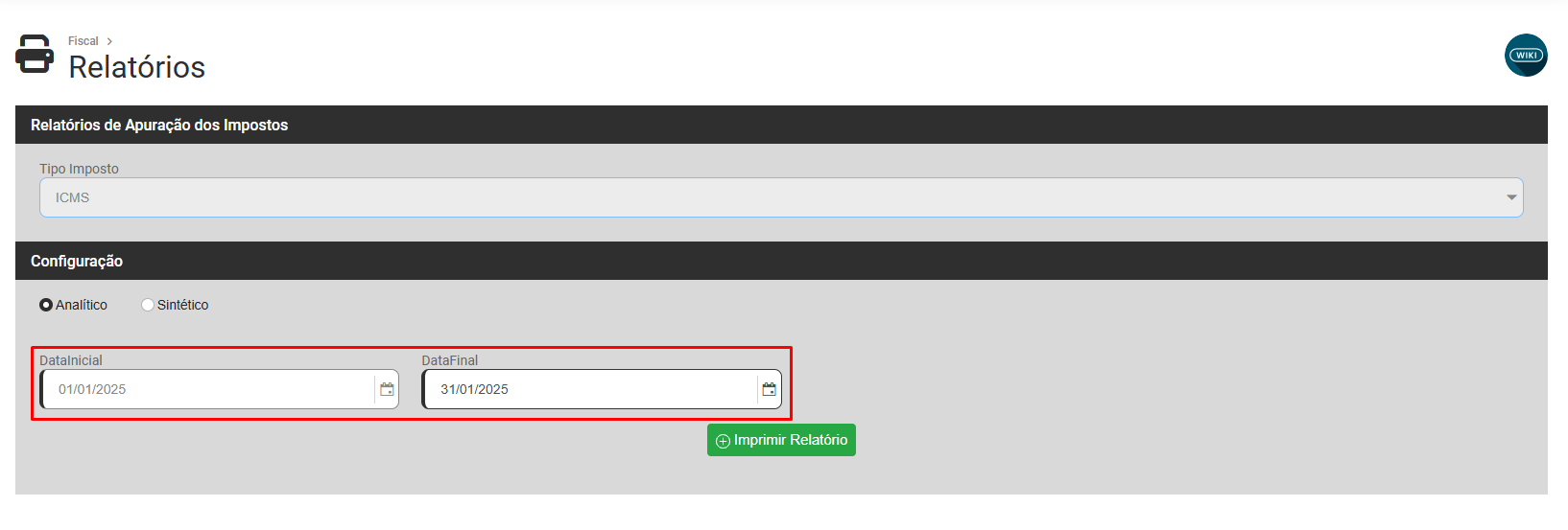 Em seguida defina a Data Inicial e Data Final do Relatório, clique em Imprimir Relatório