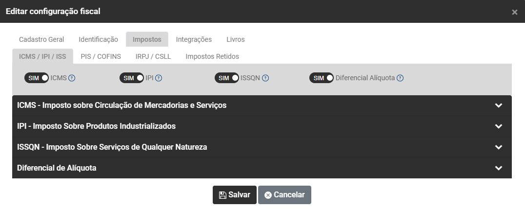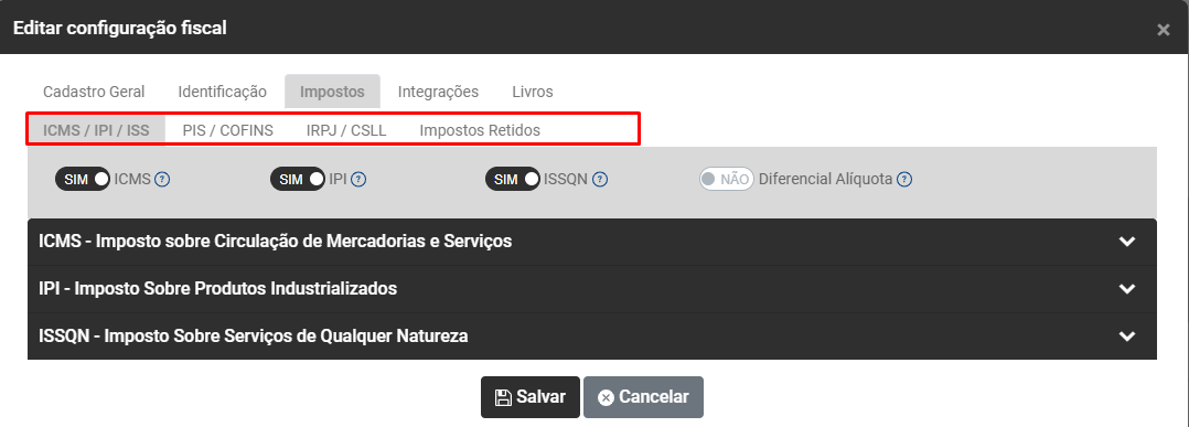 Na aba Impostos você encontrará 4 Sub Abas