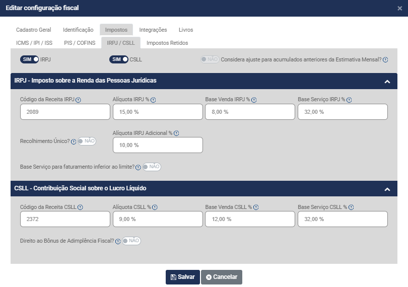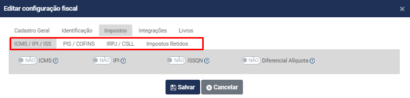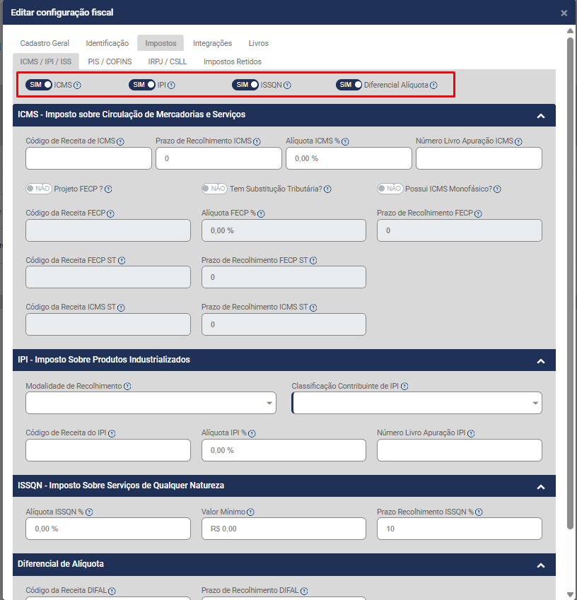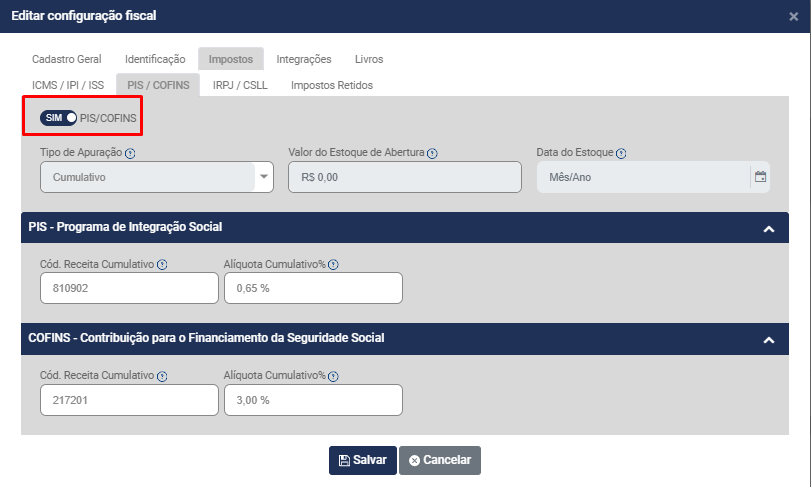 Após essa definição serão apresentados os campos para que você defina a Configuração para apuração de cada imposto selecionado