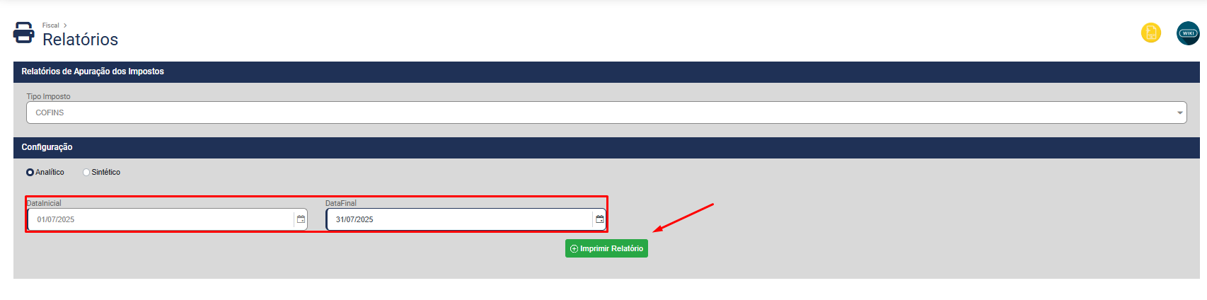 Em seguida defina a Data Inicial e Data Final do Relatório, clique em Imprimir Relatório