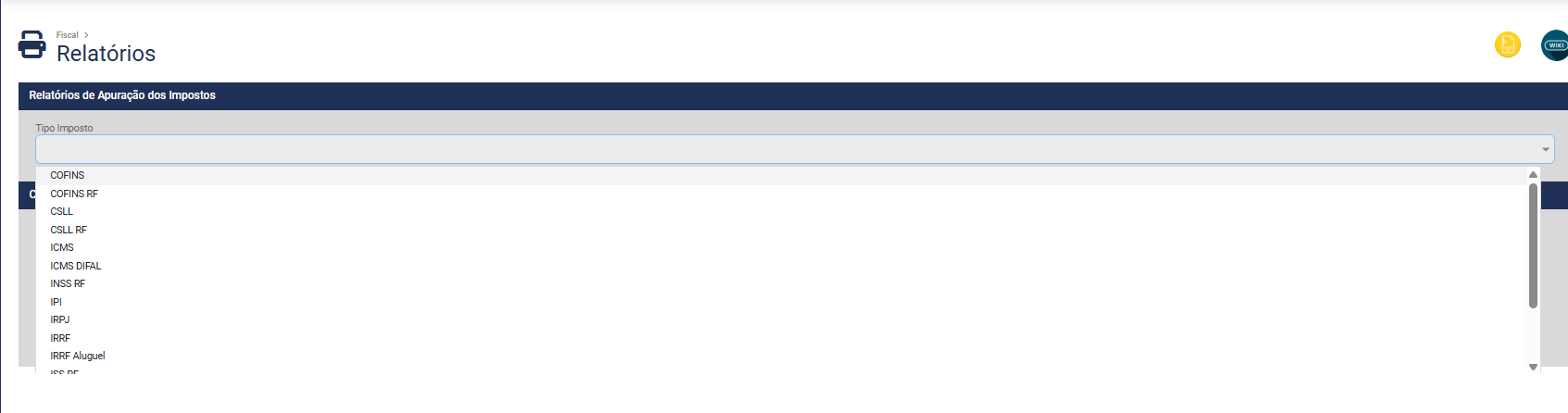 Você deverá acessar o campo Tipo de Imposto e definir qual é o Imposto que deseja Imprimir o Relatório
