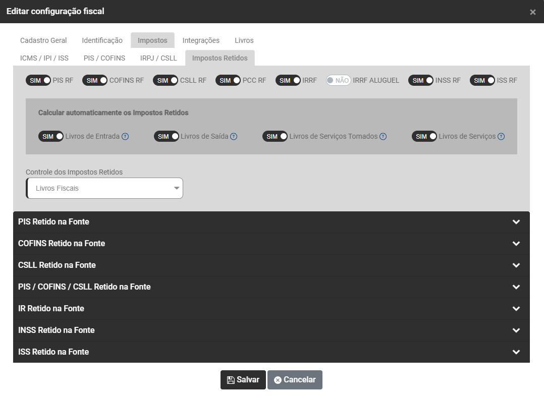 Após essa definição serão apresentados os campos para que você defina a Configuração para apuração de cada imposto selecionado