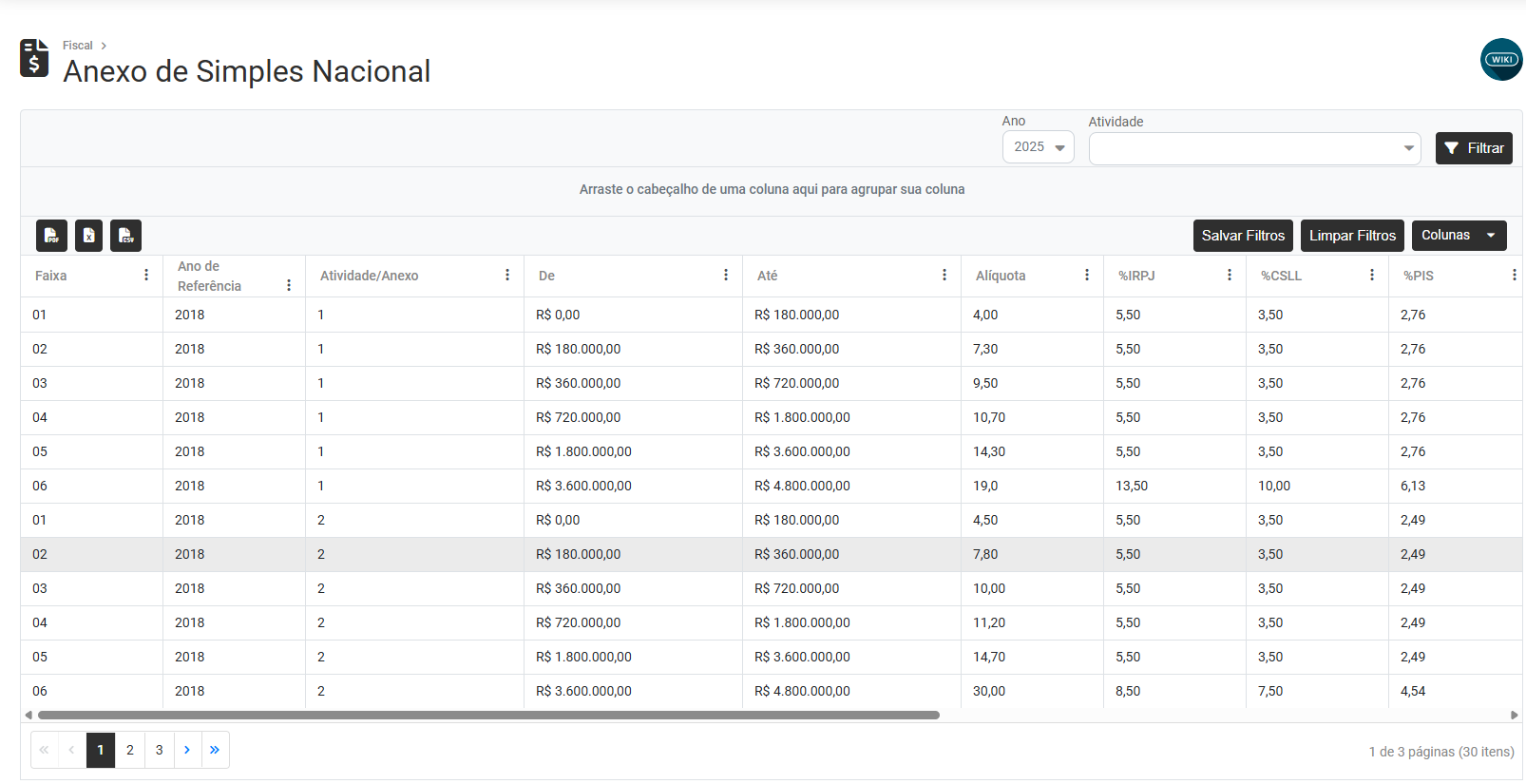 O Sistema apresentará a tela contendo o Grid com as faixas do Simples Nacional, contendo: