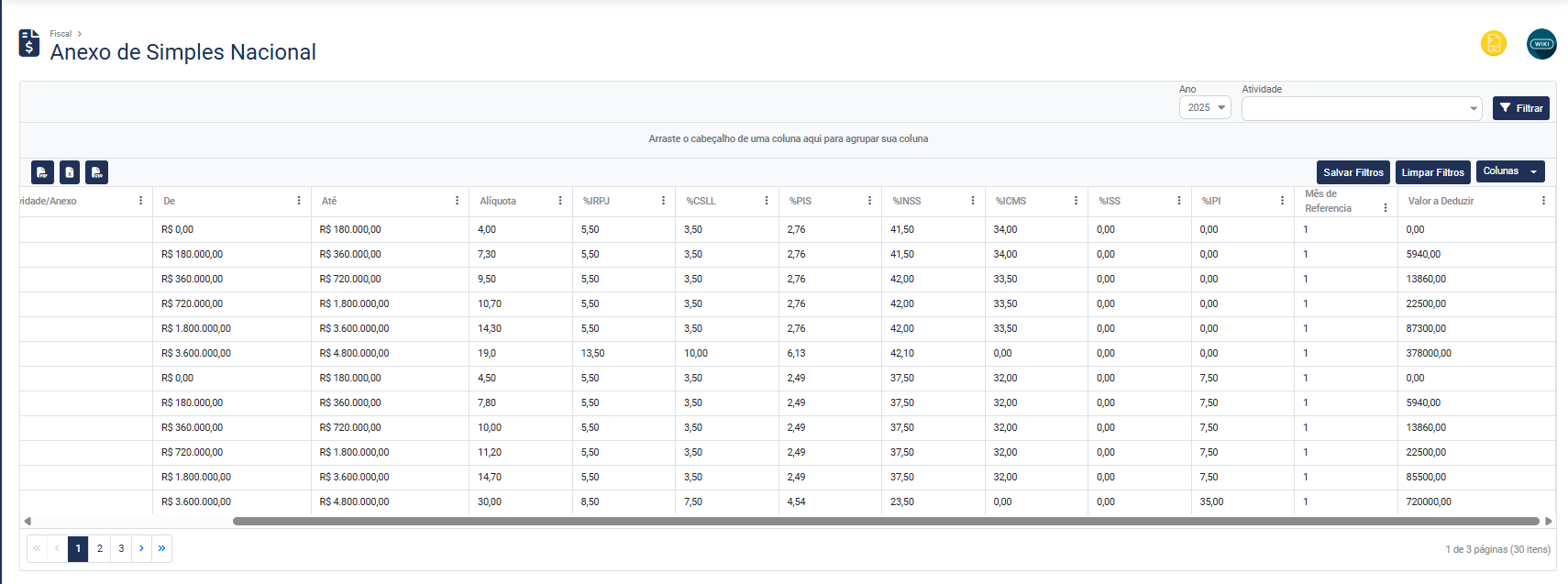 O Sistema apresentará a tela contendo o Grid com as faixas do Simples Nacional, contendo:
