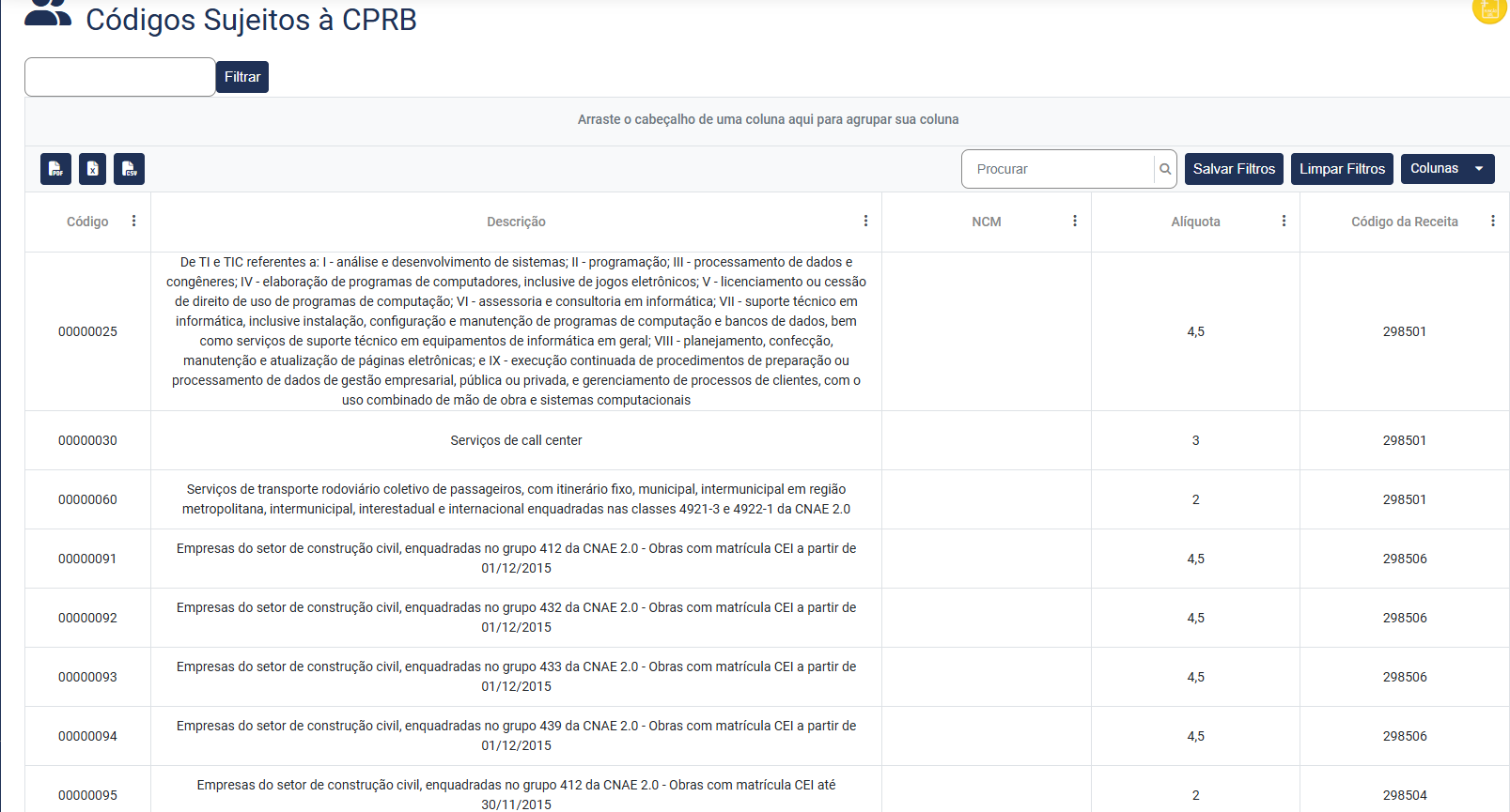 Para visualizar o Cadastro dos Códigos Sujeitos a CPRB acesse o menu Tabelas>Códigos Sujeitos a CPRB