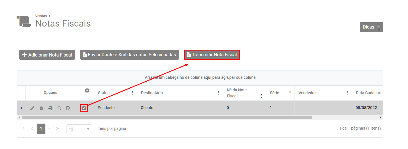 Em seguida Selecione a nota e clique no botão Transmitir Nota Fiscal.