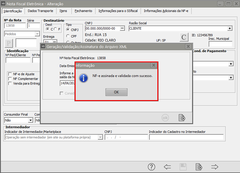 Se a NF-e estiver corretamente cadastrada, será assinada e validada com sucesso.