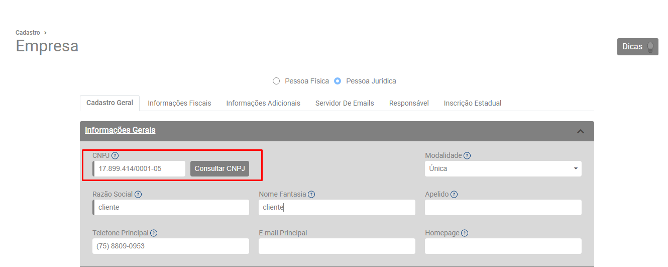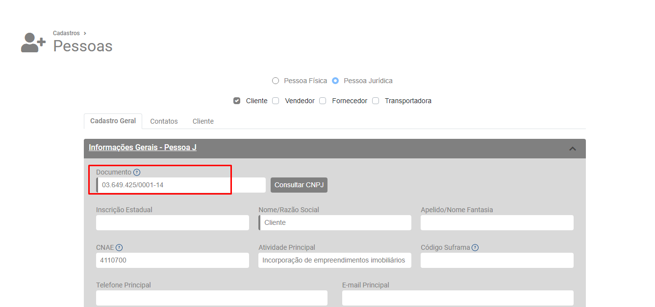 Confira a informação digitada no campo CNPJ do cadastro do Cliente