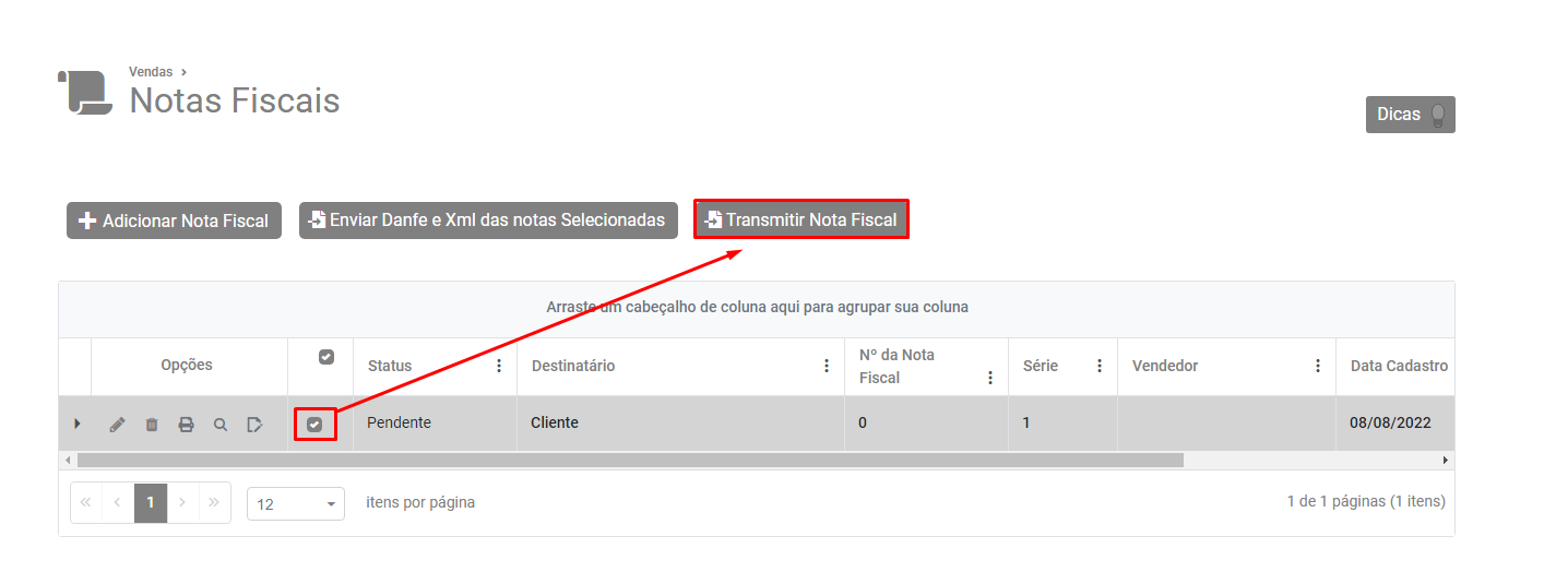 Em seguida, selecione a nota e clique no botão Transmitir Nota Fiscal.
