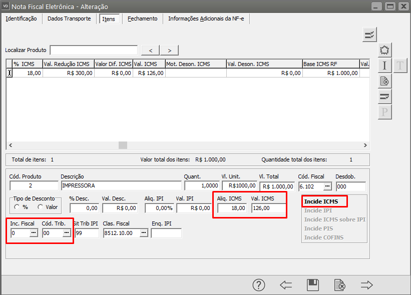 Acesse a aba Itens e confirme a informação digitada no campo Incidência Fiscal, Código de Tributação, Alíquota de ICMS e Valor de ICMS.
