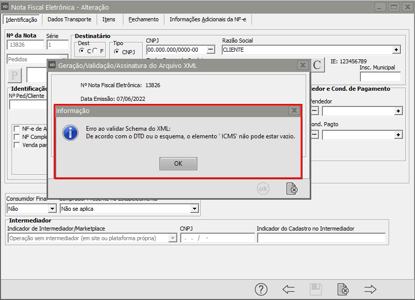 De acordo com o DTD ou o esquema, o elemento “ICMS” não pode estar vazio