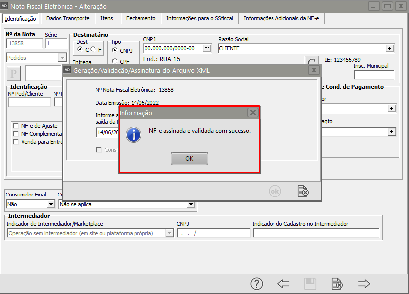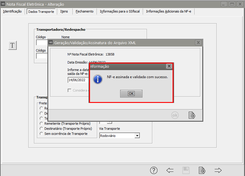 Se todas as informações estiverem corretamente cadastradas, a NF-e será assinada e validada com sucesso.