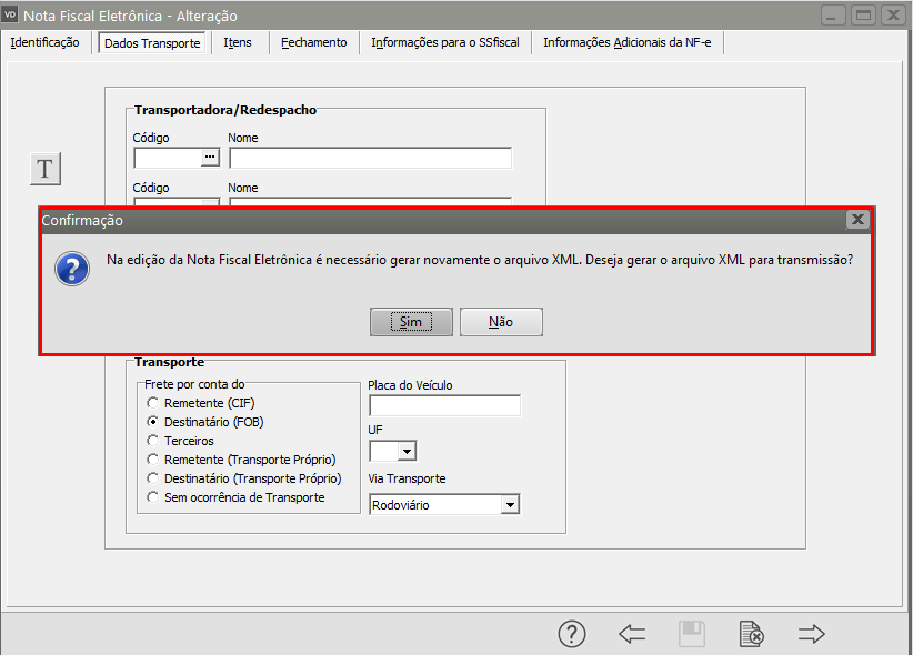 Salve a NF-e e o sistema irá questionar se você deseja gerar um novo XML para transmissão, clique em SIM.