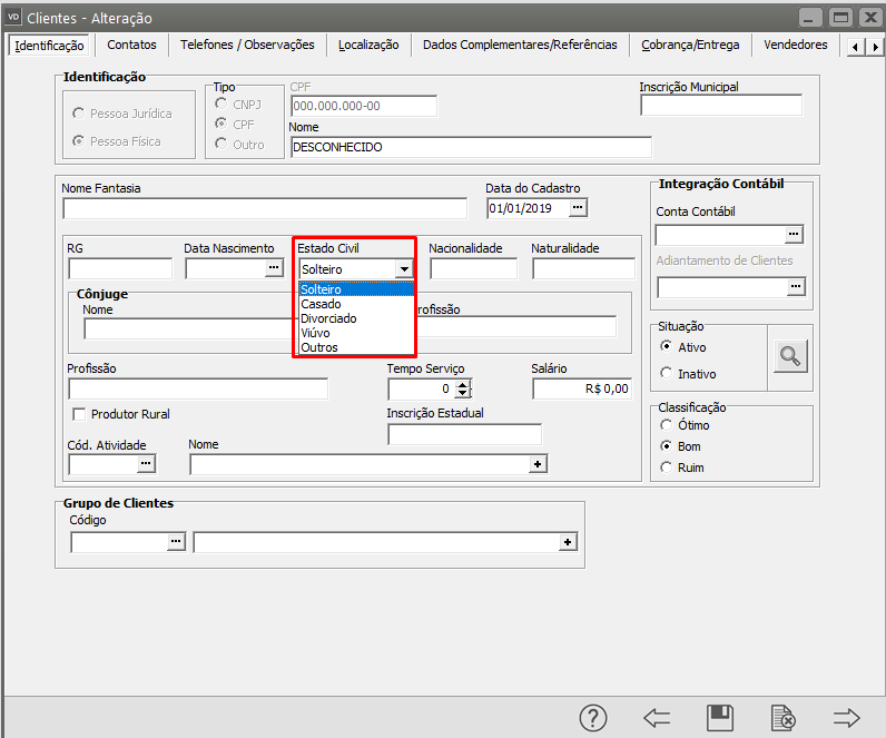 Verifique se foi informado corretamente o Estado Civil do Cliente, se for necessário faça alteração/correção e salve o cadastro.