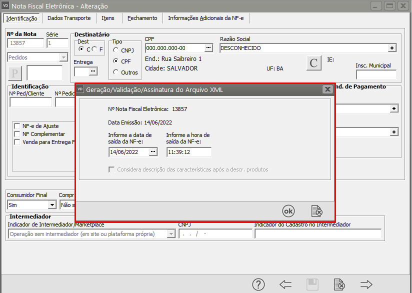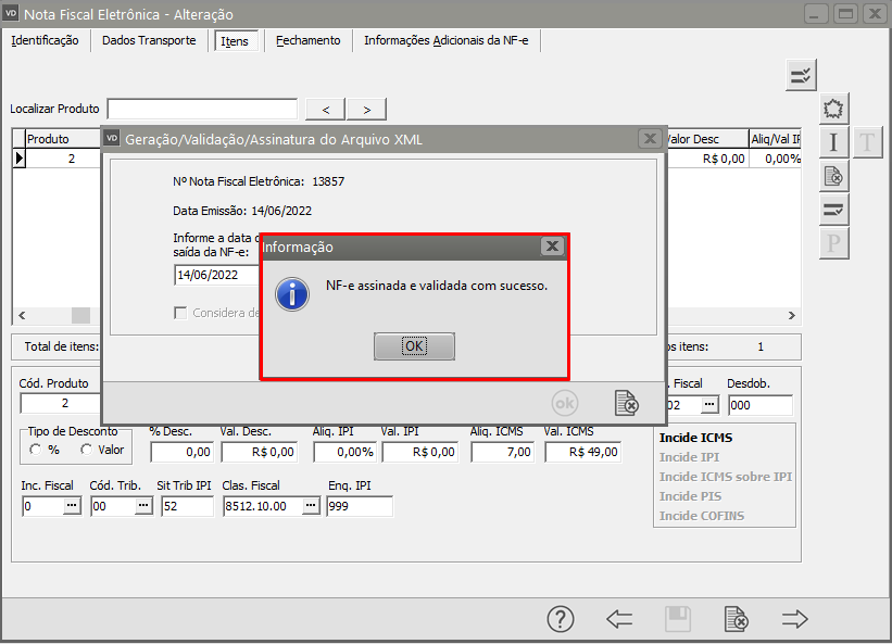Se todas as informações estiverem corretamente cadastradas a NF-e será assinada e validada com sucesso,
